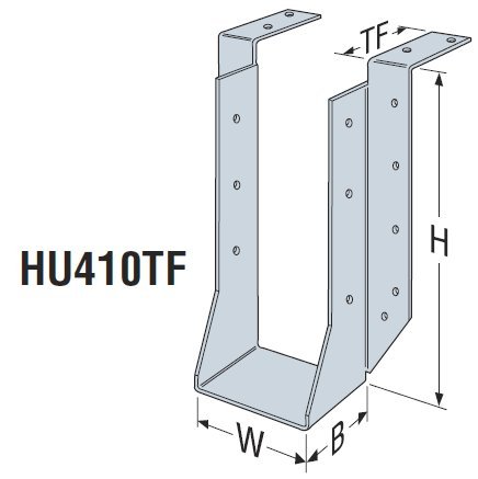 Features12 Gauge3-9/16"W x 9-1/8"H x 2-1/2"B x 2-1/2"TFUse with 16d Fasteners in the face and 10d in the JoistZinc galvanized finish containing 0.90oz of zinc per square foot of surface area (total both sides) 25 Pack Simpson Strong Tie HU410TF 4x10 Heavy Duty Top Flange Joist Hanger?