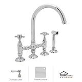 Rohl A1461LPWS-2 Country Kitchen Bridge Faucet with Side Spray and Porcelain Lever Handles, Polished Nickel. Country Kitchen Bridge Faucet with Side Spray and Porcelain Lever Handles Born in the Piedmonte region of France, an area known for its rich tradition of cuisine and culture, the Country Kitchen collection is defined by exquisite design. Straight lines are paired with gentle curves and ribbing details to create a classic look that is as popular today as it was years ago. And with function set as the cornerstone of all Rohl products, rest assured that the beauty of the Country Kitchen collection does not overshadow its use. Smooth handle operation, lifetime ceramic disc valves, and a sturdy feel that only all-brass construction could allow are all defining features of the Country Kitchen collection. As one of Rohl's largest collections, you will find that there are a variety of bold styles and finishes to choose from. Rohl A1461LPWS-2 Features: All brass faucet body construction - weight: 13 lbs. Hand-machined from solid brass stock Industry leading, 1/4 turn lifetime ceramic disc valve Superior finishing process - chemical, scratch, and stain resistant Number of installation holes required: 4 Spout swivels to allow for unobstructed sink access Insulated brass side spray (not plastic) Bridge-style, above the counter mixing valve Center-to-center distance between handle installation holes (faucet centers): 8" 2.2 gallons-per-minute flow rate Installs onto decks up to 2-1/8" thick Porcelain lever handles included Overall height: 13-15/16" (measured from counter top to highest point of faucet) Spout height: 9-3/8" (measured from counter top to faucet outlet) Spout reach: 8-15/32" (measured from center of faucet base to center of faucet outlet) Low lead compliant - complies with federal and state regulations for lead content Designed for use with standard U.S
